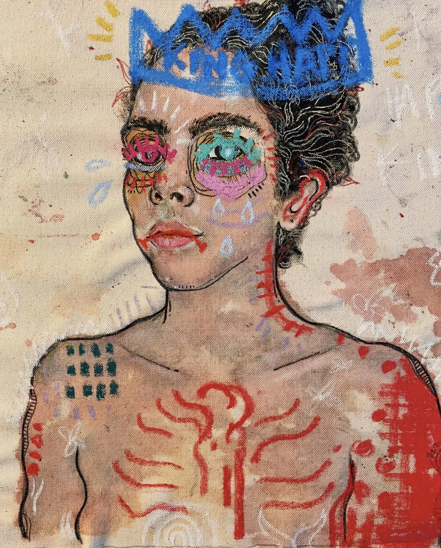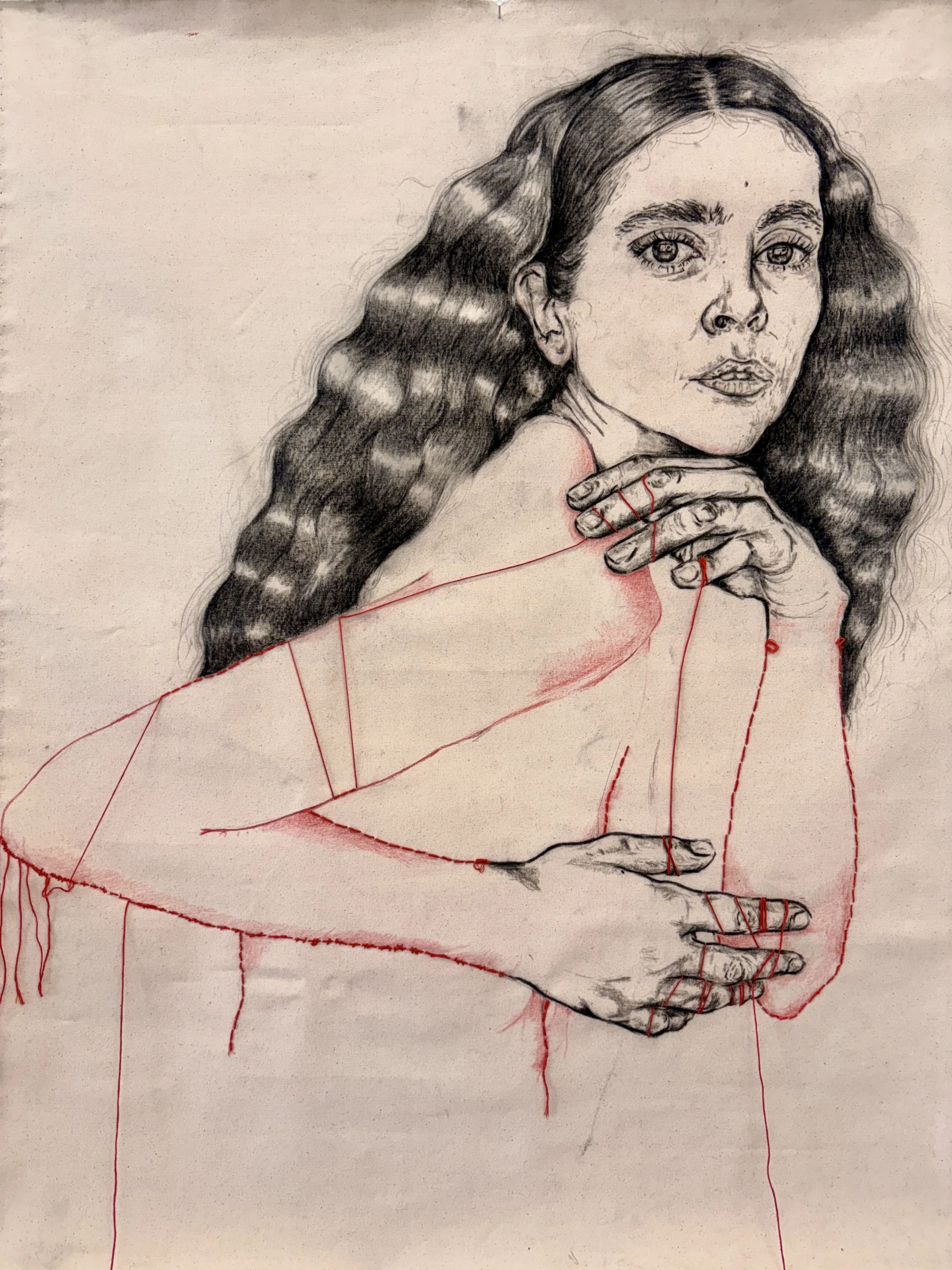 Tengo hilos. Tengo huecos. Tengo amargos. | Charcoal, color pencil, thread on untreated canvas. | 39.2 inches x 32 inches.