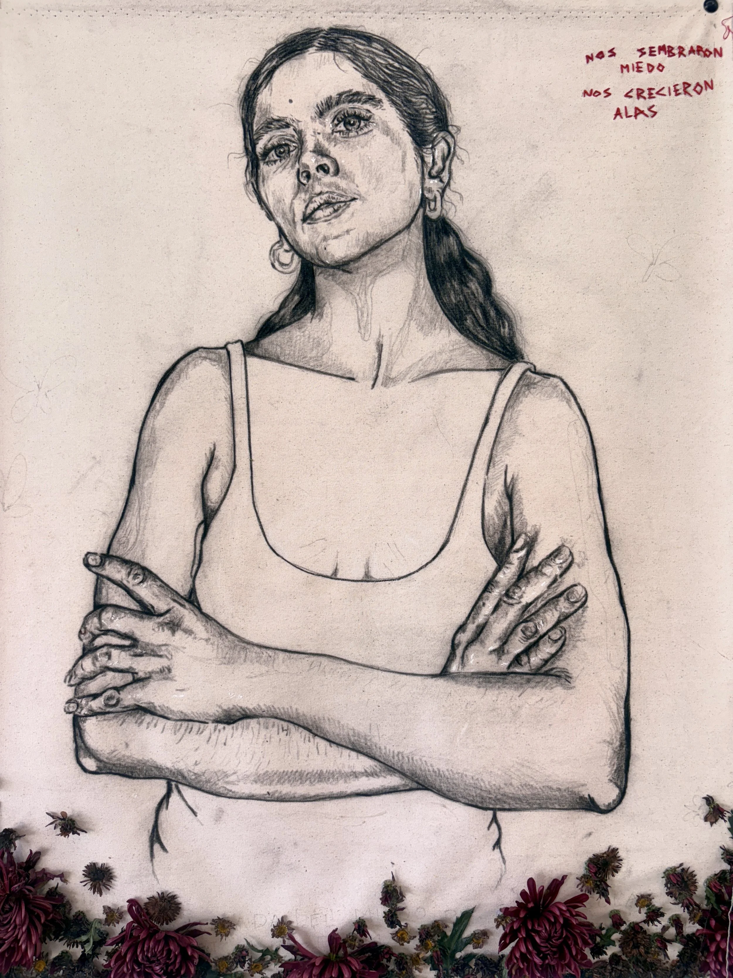 Una terapia después de un shock en la calle. | Charcoal and dried flowers on untreated canvas. | 36 inches x 28 inches